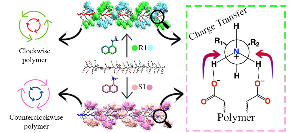 I studied the helical induction process of cis-transoid poly 4-(carboxyphenyl) acetylene by chiral amines combining computational Molecular Dynamics (MD) and Density Functional Theory (DFT) approaches.
