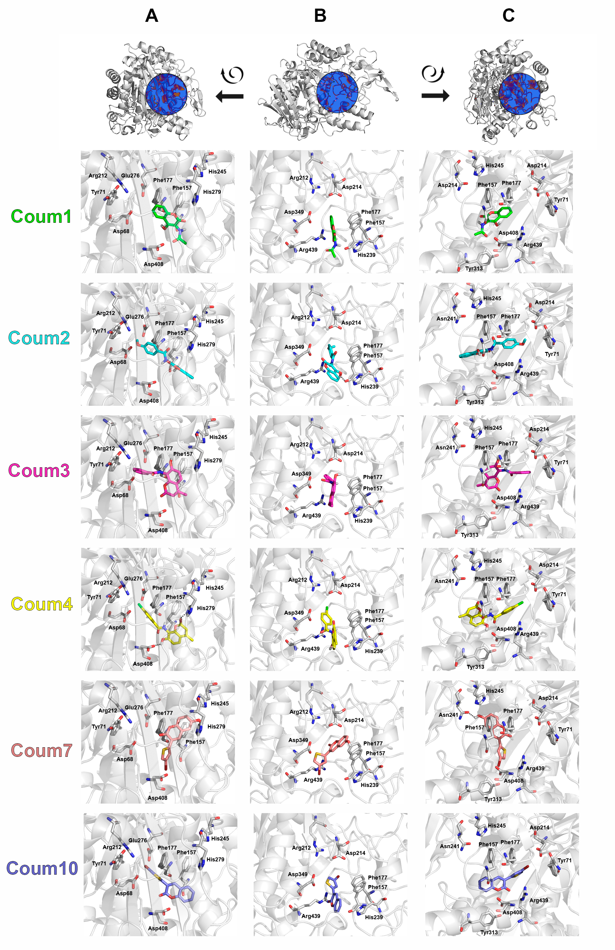 The computational study was carried out to identify and compare the catalytic site or a second hydrophobic site to better understand the interactions between coumarins and the enzyme under study. Due to the lack of structural information of α-(1,4)-glucosidase homology models were obtained using the Swiss model server and sequences from UniProt Server. Then BLAST analysis was performed to obtain protein templates to create the protein models. The coumarin studied were created and optimised using Gaussian09 and charge parameters were obtained using RED-III.4 program. Finally, docking calculations were obtained using Autodock Vina and the results were analysed using energy scoring values and interactions using LigPlot+. Our results published in *Current Topics in Medicinal Chemistry* revealed that coumarins bind in a more external area of α-(1,4)-glucosidase comparing to the substrate displaying aromatic and hydrophobic interactions, as well as some hydrogen bonds. Aromatic interactions with two phenylalanine residues, 157 and 177, were the most common among the studied coumarins.
