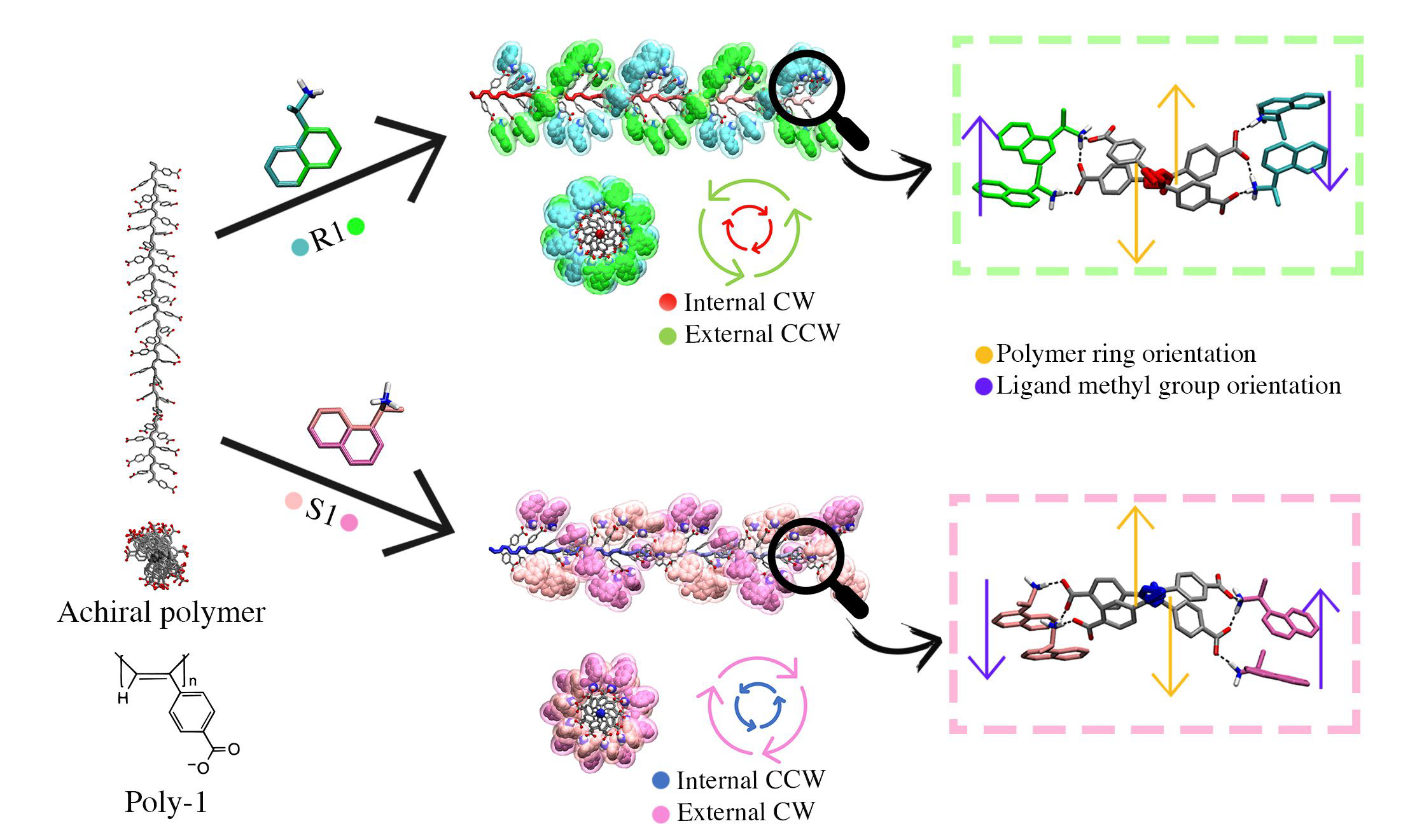 In this work I studied the helical induction process of poly-1 interacting with (R)- and (S)-1-(1naphthyl)ethylamine (R1 and S1), which is an important reference system. Combining computational Molecular Dynamics (MD) and Density Functional Theory (DFT) approaches, I tested the flexibility of the polymer helical models and the interactions of polymer-amine complexes.