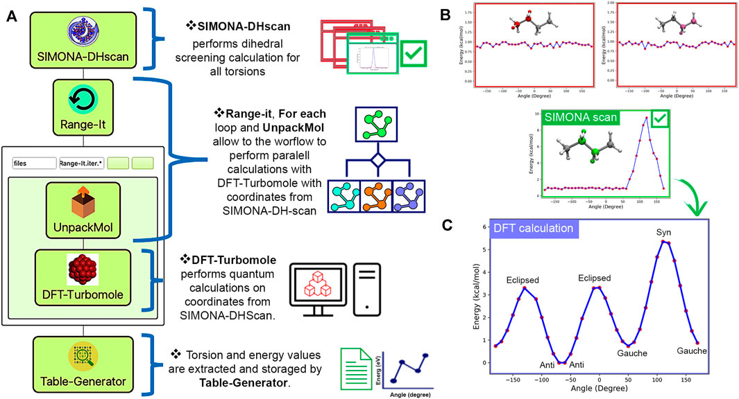 SimStack was also used to explore the possible dihedral values on the backbone of the polymer, using SIMONA, TURBOMOLE, and SimStack. The WaNo SIMONADHscan was built to generate molecular structures using SMILES code as input. Then a specific SIMONA scan protocol was individually applied to all possible torsion angles identified. The scan protocol uses the metropolis MC algorithm to perform arbitrary rotations of a selected torsion angle and apply relaxations on adjacent torsion angles. The total energy of each configuration is calculated using the Coulomb, and Lenard-Jones terms from GAFF.