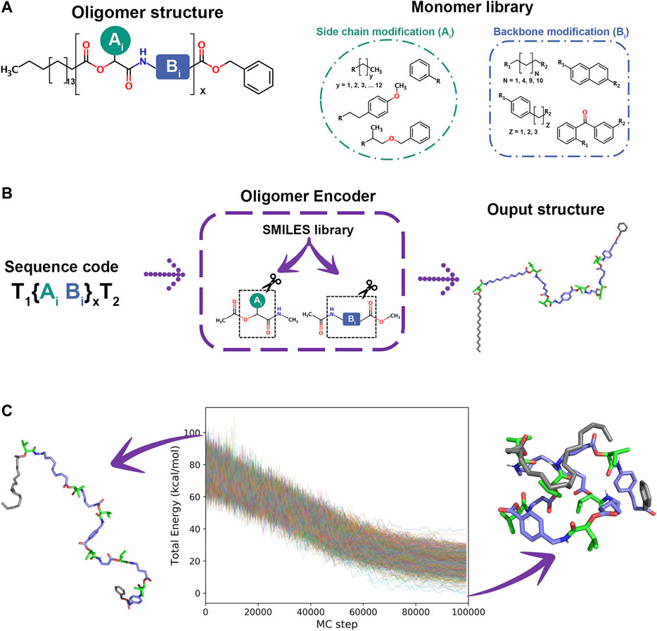 SimStack was used to study the possible conformations of oligomer sequences. A protocol was created to systematically create oligomer atomic models from Oligomer Encoder (OE) sequences. OE is a tool containing a monomer library of SMILES codes linked to a three letter code similar to a 3-letter proteins amino acid system. These monomers are then optimised using TURBOMOLE . The optimized monomer structures are used to calculate charges using the AM1-BCC method. Parameters from the General Amber FF are extracted with Acpype to generate GROMACS input files. Once GROMACS input files are created, Monte Carlo simulation inputs are generated using the Python protocol provided by SIMONA. This strategy allows OE to be a highly scalable molecule builder.