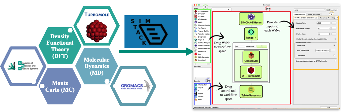 SimStack is a lightweight client-server program developed by Prof. Wenzel’s group at the Karlsruhe Institute of Technology (KIT) and Nanomatch GmbH. It provides a graphical user interface to construct simulation workflows from individual program or protocol units called Workflow Active Nodes (WaNos) using High Power Computer (HPC) resources. SimStack uses Extensible Markup Language (XML) format to generate the graphical interface for the settings of each WaNo, which is human readable and user friendly language, even for non-developer users. SimStack can be easily used by non-computer scientists to make closer the relationship between experiment-theory and vice versa.